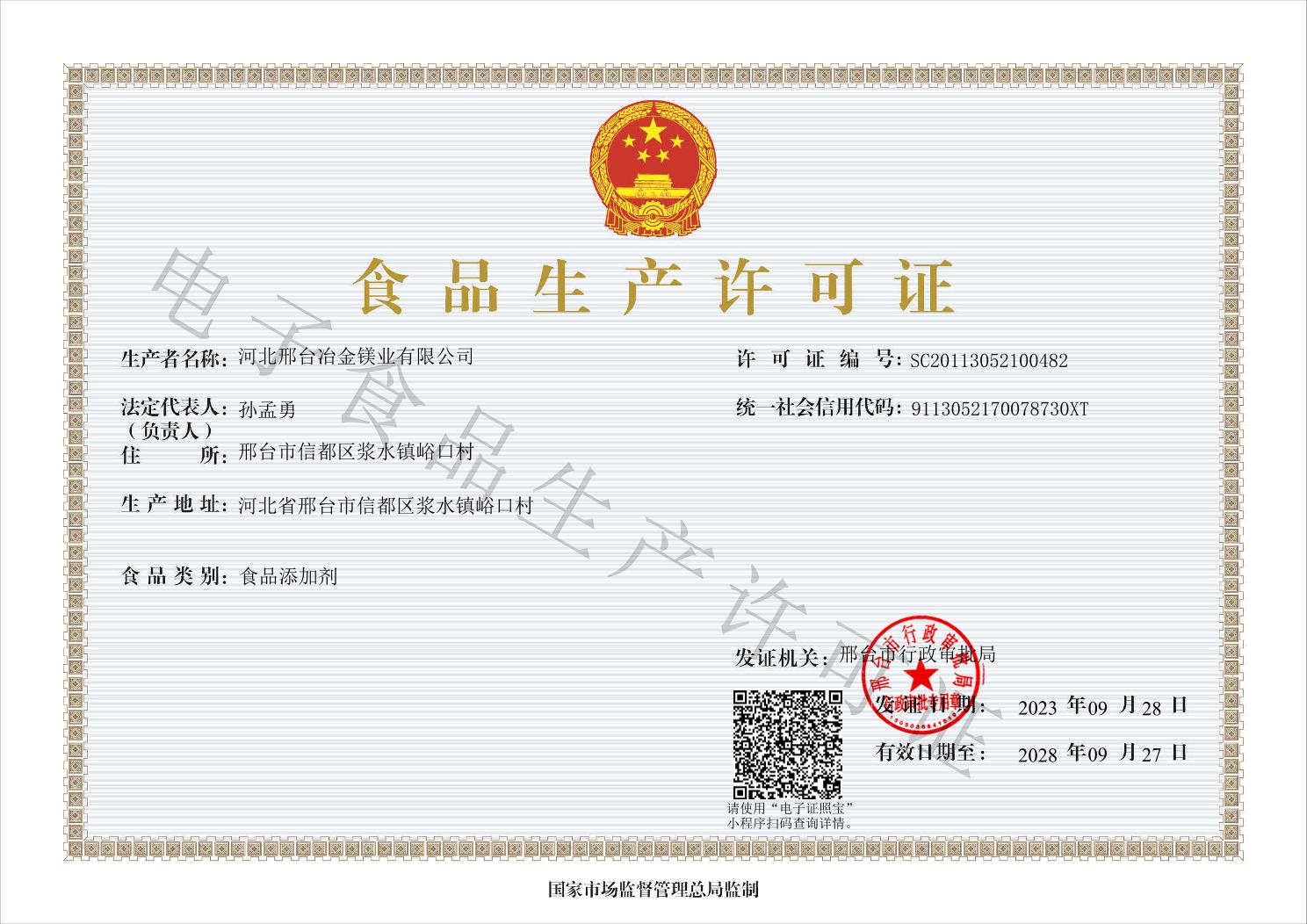 冶金鎂業(yè)食品生產(chǎn)許可證正本