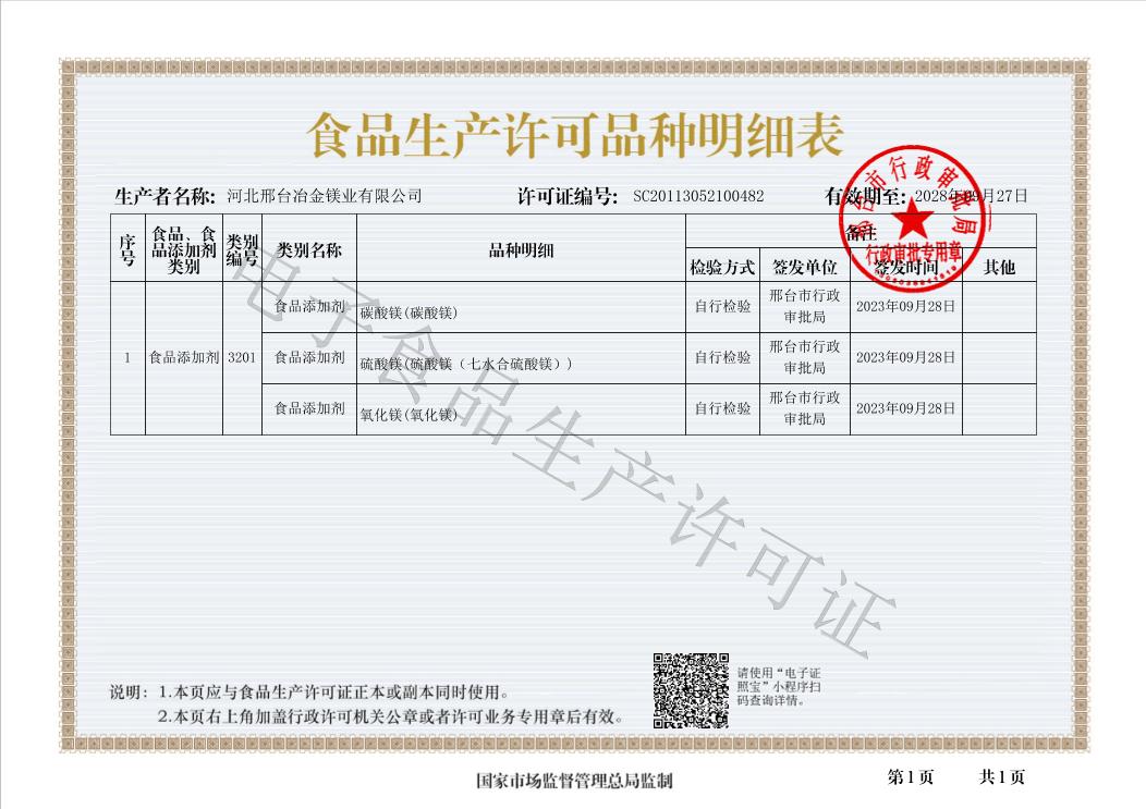 冶金鎂業(yè)食品生產(chǎn)許可品種明細(xì)表
