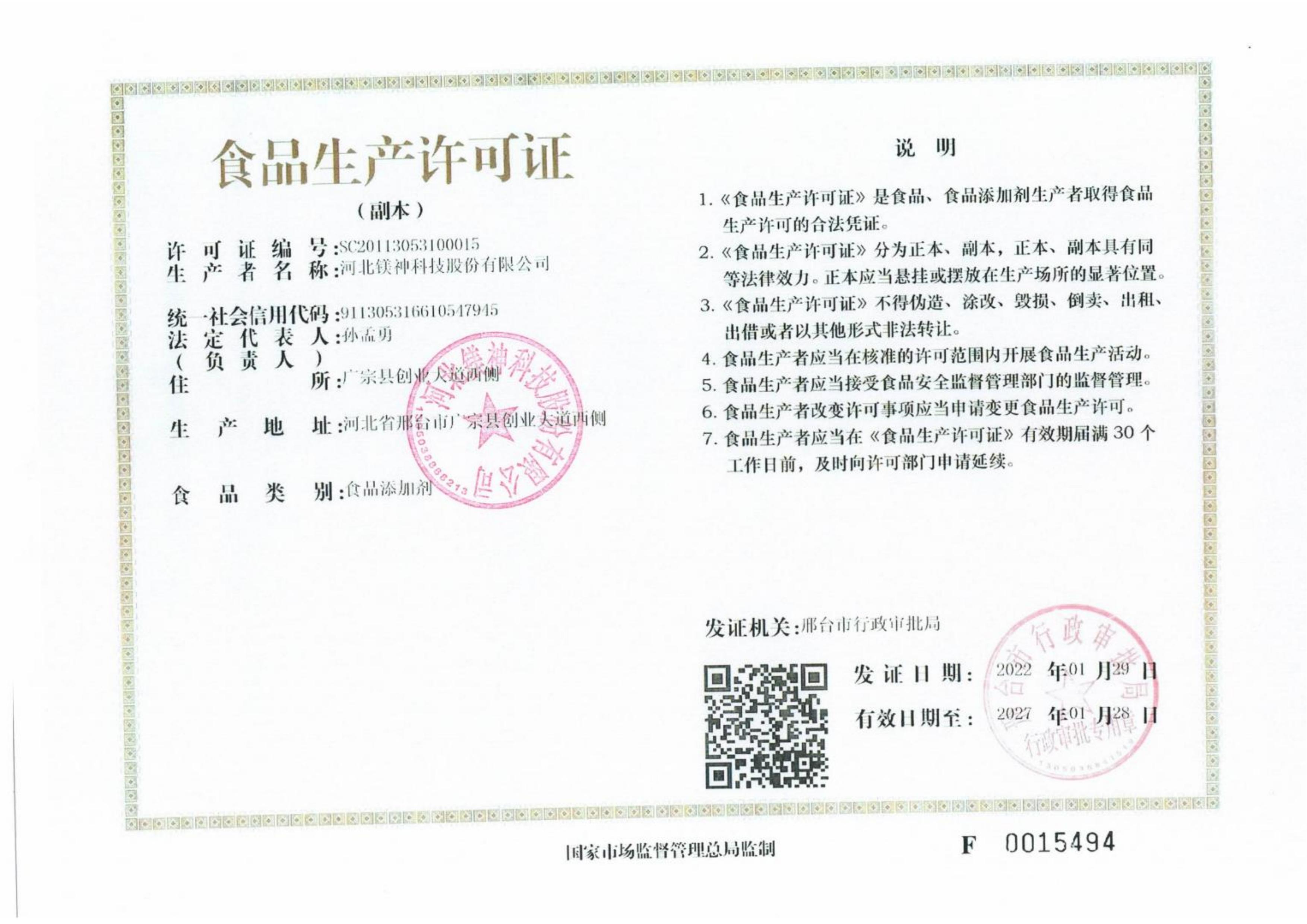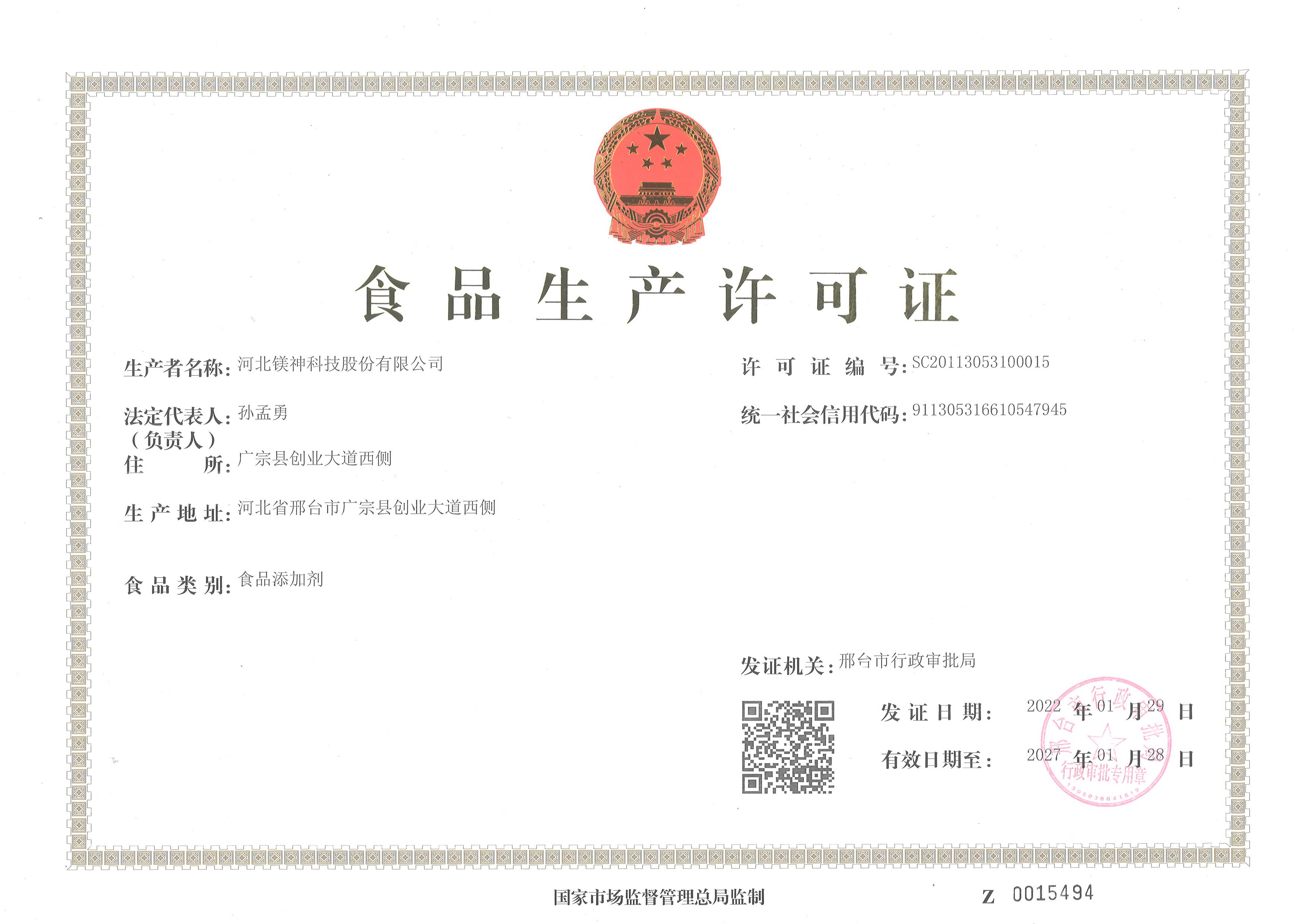 鎂神食品生產(chǎn)許可證正本