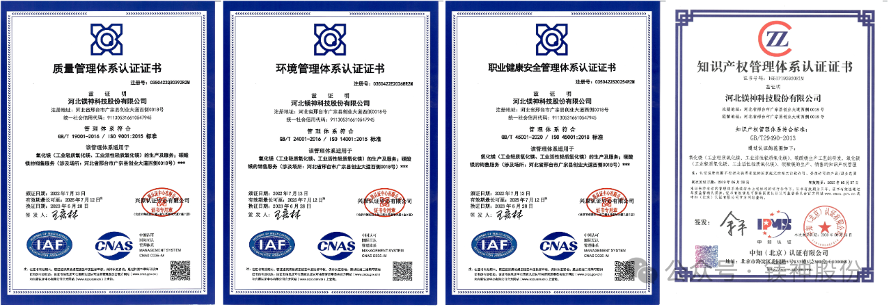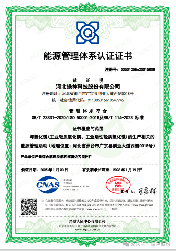 近日,河北鎂神科技股份有限公司獲能源管理體系認證證書,成為行業內首家通過這一重要認證的企業。這標志著公司在能源管理體系建設方面達到了新的里程碑,進一步鞏固了其在氧化鎂行業的領先地位。