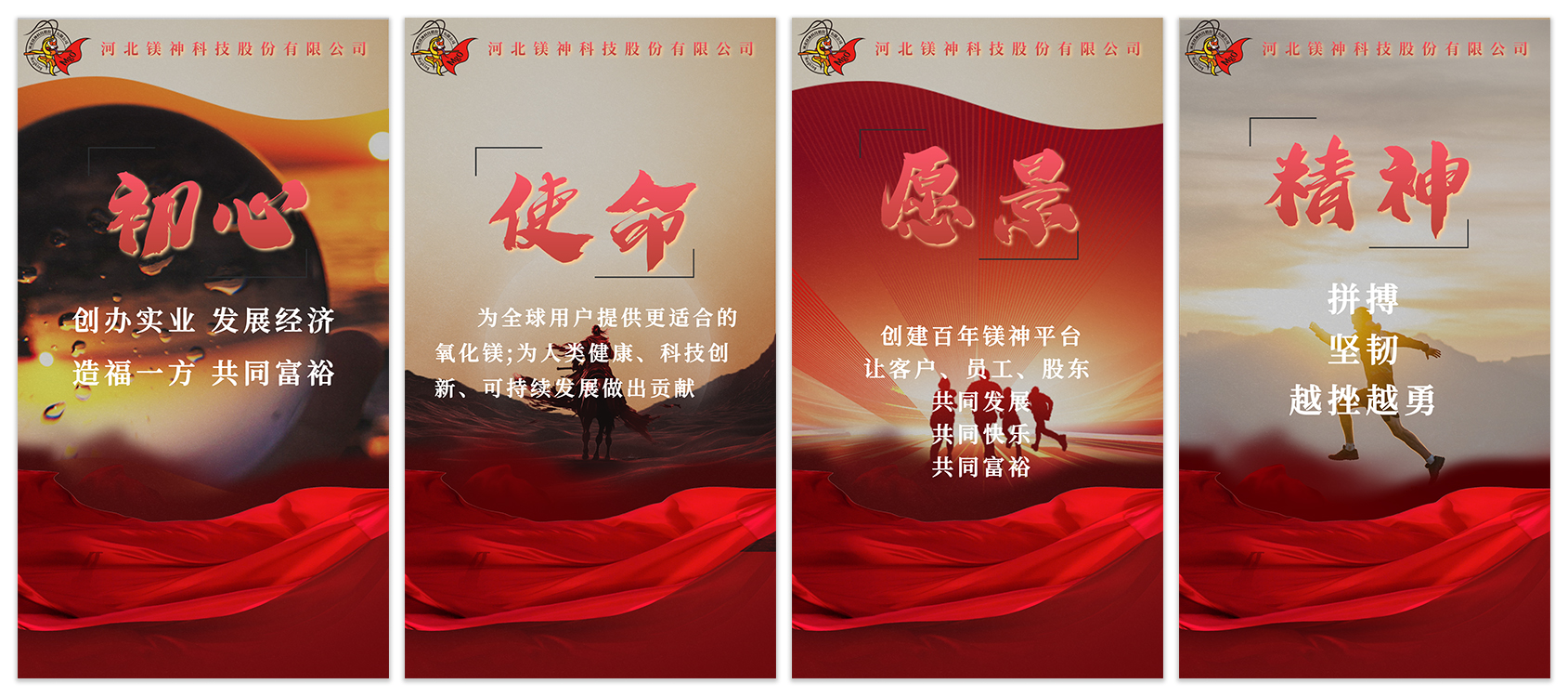 鎂神科技以創辦實業,發展經濟,造福一方,共同富裕為初心;秉承著為全球用戶提供更適合的氧化鎂,為人類健康、科技創新、可持續發展作出貢獻的使命;有著創建百年鎂神平臺,讓客戶、員工、股東共同發展、共同快樂、共同富裕的美好愿景;培育出拼搏、堅韌、越挫越勇的鎂神人。鎂神人用誠信、激情、夢想、狂學、內省、溝通、合作、創新、利他的價值觀向客戶、社會各界朋友詮釋著鎂神的企業文化!