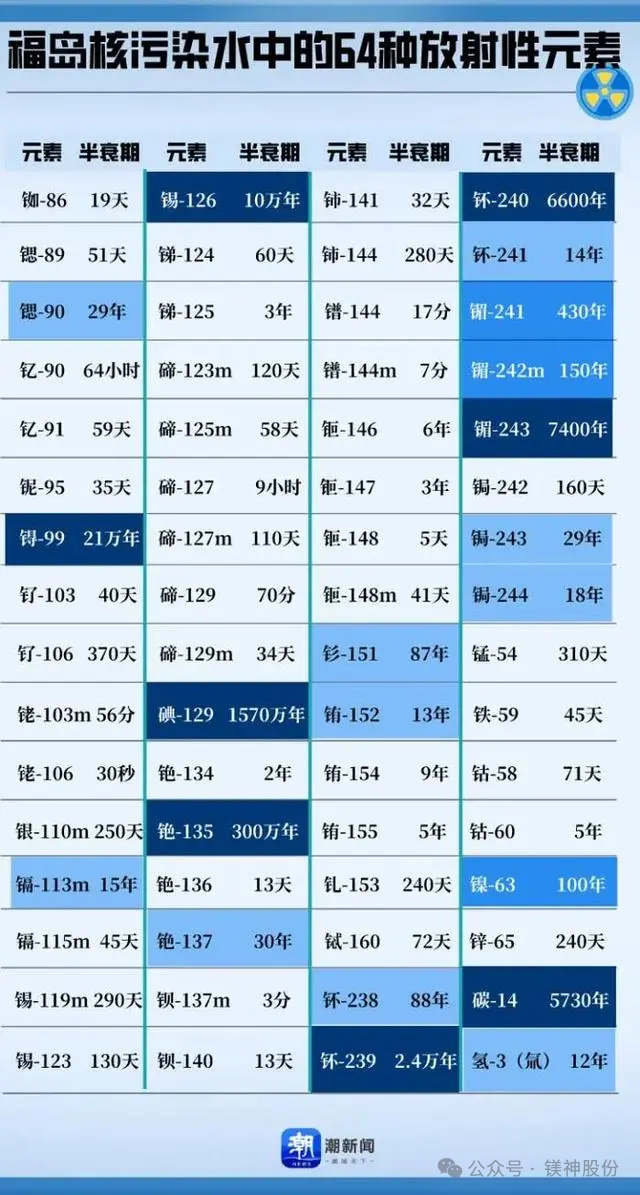 我們需要了解核廢水的成分和危害。核廢水中含有多種放射性元素,如氚、碳-14、鍶-90、銫-137、碘-129、钚-239和镅-241等63種放射性物質。這些放射性元素的半衰期長達幾十萬年,對人體和環境具有嚴重的危害,包括致癌、致畸和致突變等。